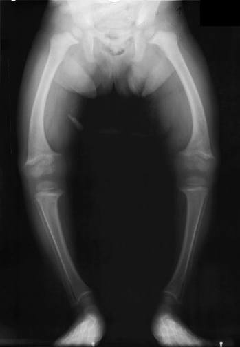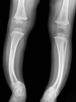 This x ray shows the legs of a person suffering from Rickets. As you can see the image is much more faded and the bone walls are much thinner. as a result this person is more likely to break bones whereas a normal person might just bruise themselves.